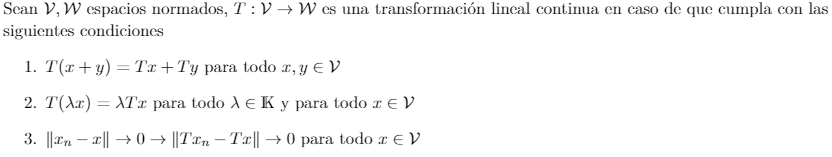 Para poder definir un operador, primero se ha de definir lo que es una transformación lineal continua de un espacio normado en otro: